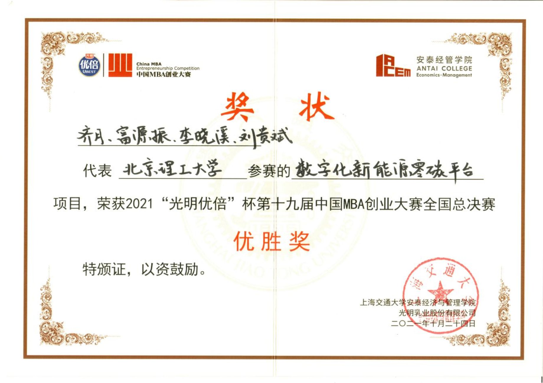 10月24日,2021“光明优倍”杯第十九届中国MBA创业大赛全国总决赛在上海举办,来自全国四个赛区的4支营销赛团队和14支常规赛团队竞相角逐。管院专硕20级MBA学生齐月、李晓溪、刘贵斌、富源振的“数字新能源零碳平台”项目经过激烈角逐,在此次大赛中获得总决赛优胜奖的好成绩。在比赛中他们淡定从容,应答有条不紊,展现出北理学子低调内敛而又明理精工的气质!